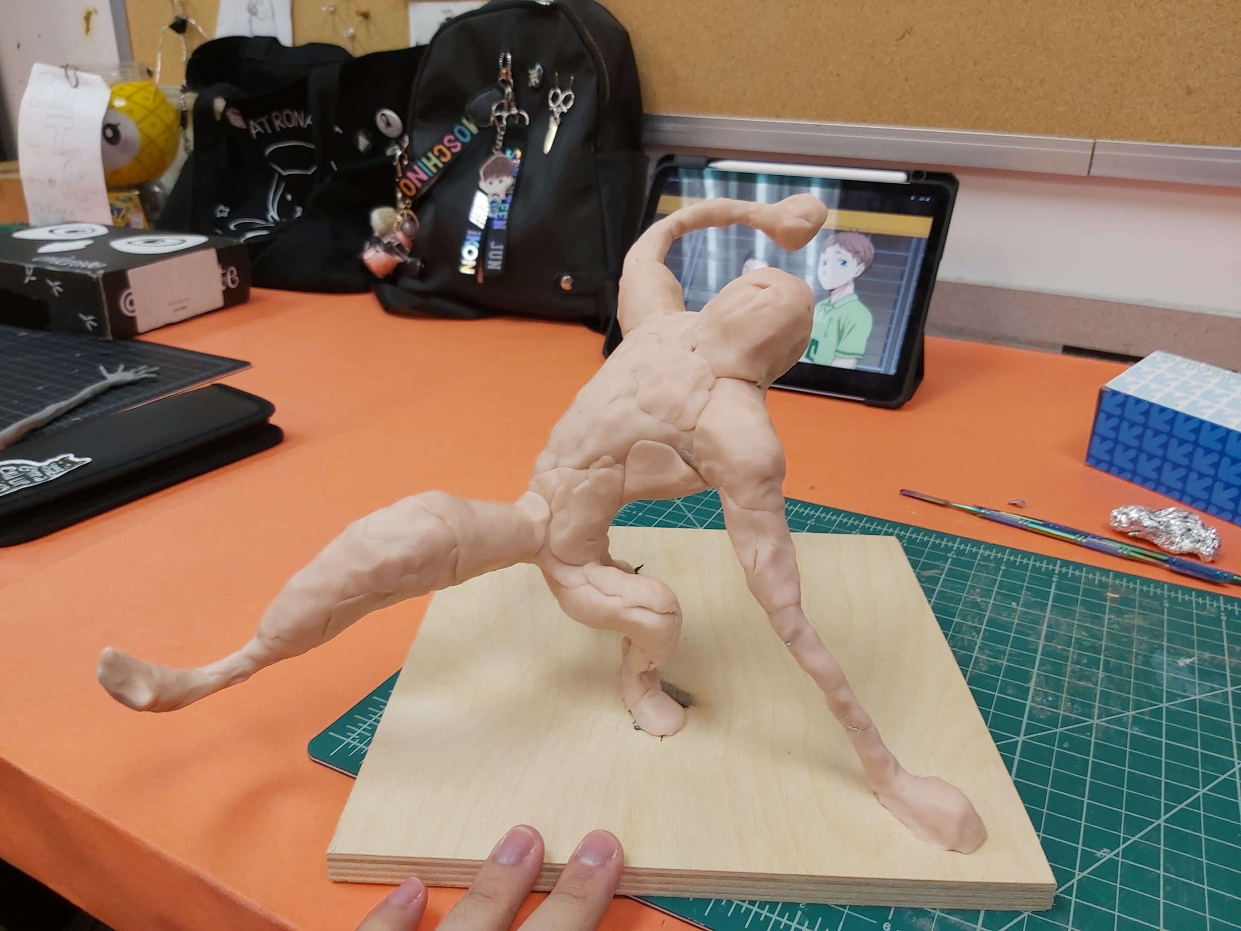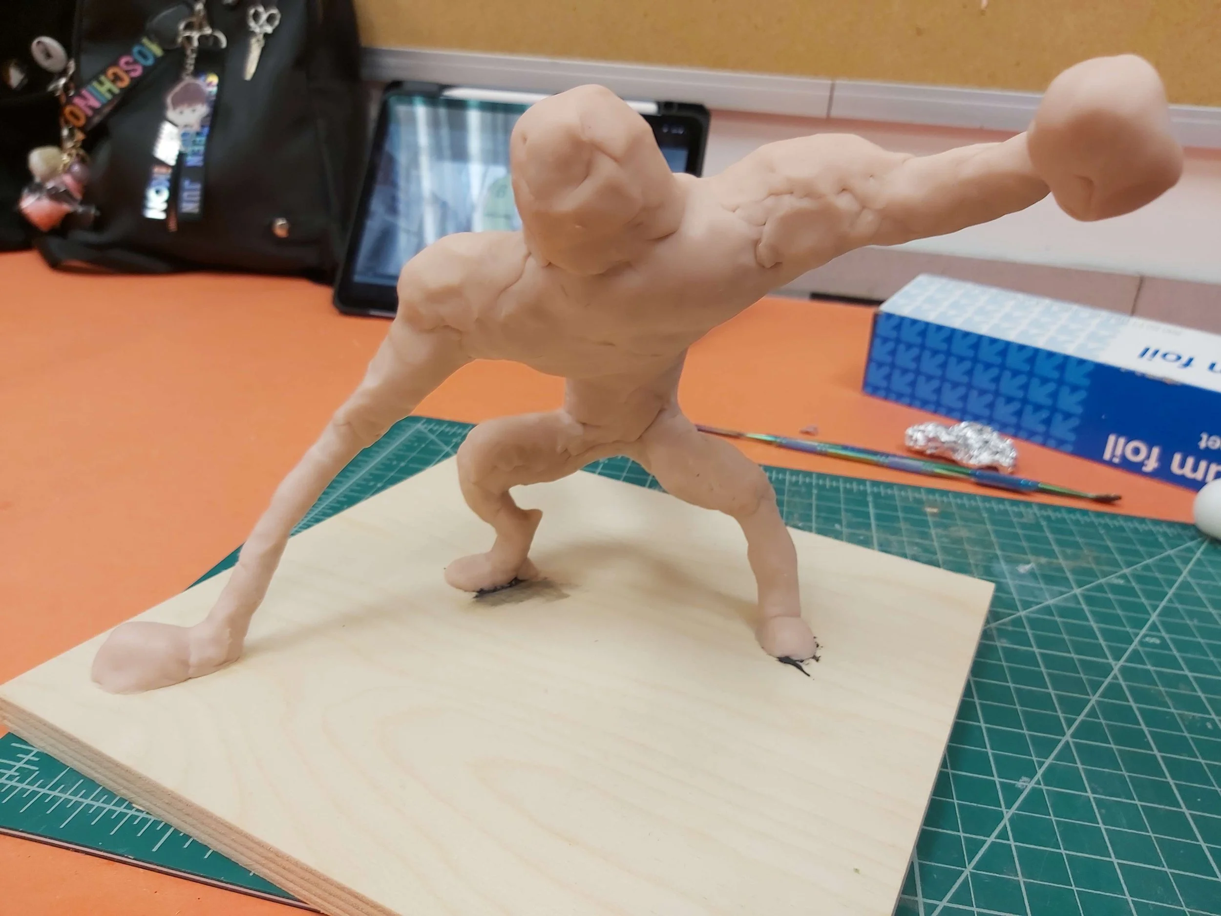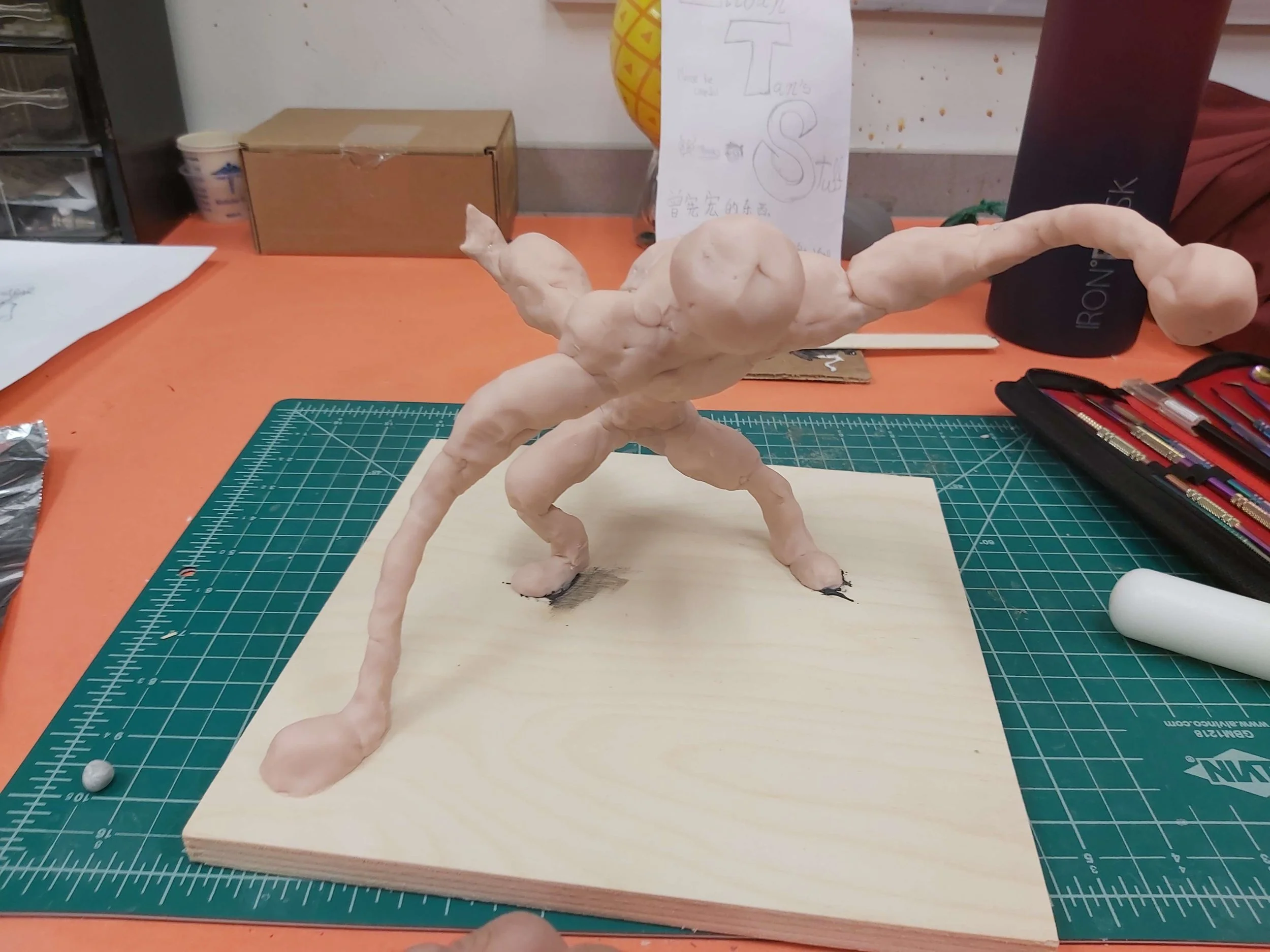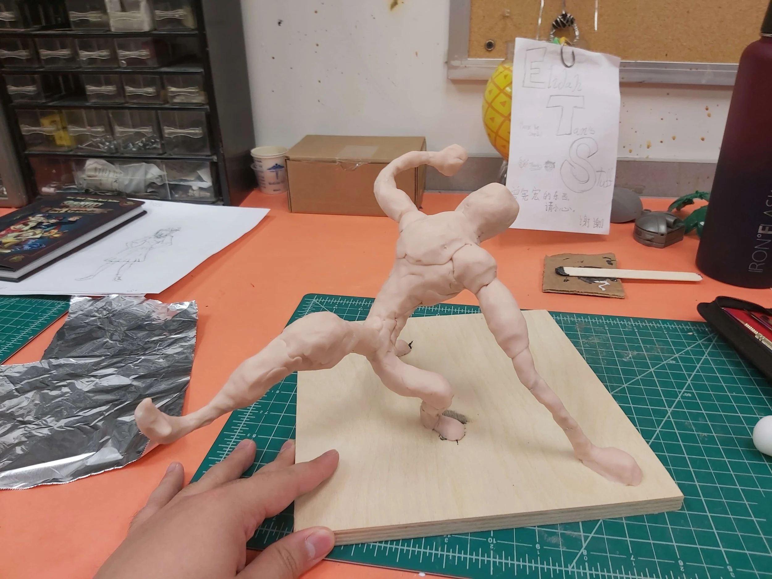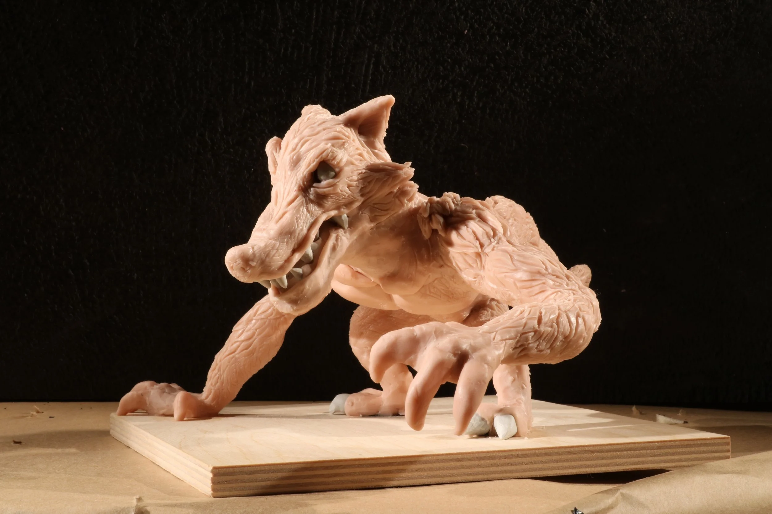 I unfortunately to do not have a photograph of the original sketch on it’s own. Here is design with a the maquette already under way. The face was the biggest departure as it rounded the character out too much. Originally this character was conceived as a villain so a harshness had to be added.